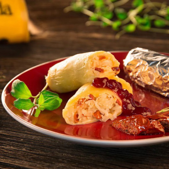 Delikatnie parzone sakiewki z sera wypełnione aromatycznym farszem z kapusty, papryczki i pomidorów, zawinięte jak domowe cukierki. Podane z wyrazistym sosem żurawinowo-chrzanowym tworzą oryginalną, nieoczywistą przystawkę lub ciepłą kolację z charakterem.