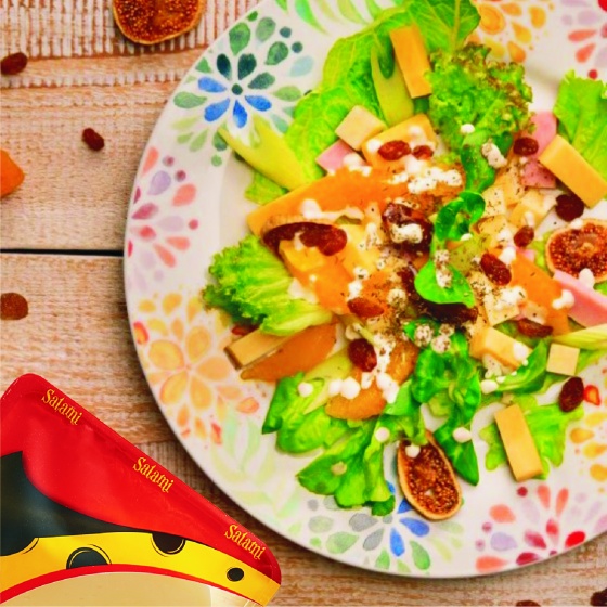 Kolorowa sałatka z serem, szynką i owocami suszonymi to połączenie wytrawnego i słodkiego w najlepszym wydaniu. Złociste rodzynki w brandy, figi, daktyle i soczyste cytrusy tworzą wyjątkową kompozycję na miksie sałat — całość skropiona lekkim sosem majonezowym. Idealna na przyjęcie, kolację z klasą albo jako efektowna przystawka.