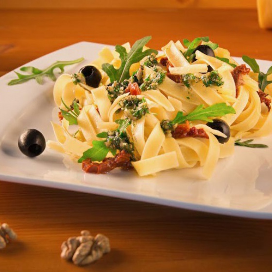 Makaron z domowym pesto na bazie rukoli, suszonych pomidorów i uprażonych ziaren słonecznika, z dodatkiem wyrazistego sera. Aromatyczne, lekko pikantne i pełne struktury danie, które smakuje równie dobrze na ciepło, jak i na zimno. Idealne do podania z oliwkami i porcją tartego sera na wierzch.