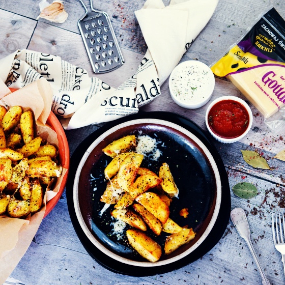 Olej wymieszać z przyprawami i podgotowanymi wcześniej ziemniakami pokrojonymi w ćwiartki. Przełożyć na blachę wyłożoną papierem do pieczenia i piec w temperaturze 200 stopni na złoty kolor, aż ziemniaki będą chrupiące, 15 minut przed końcem pieczenia posypać startym serem. Podawać z keczupem lub sosem czosnkowym.