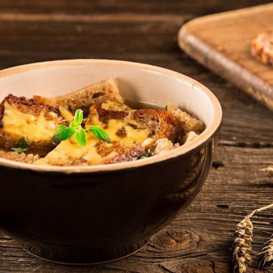 Aromatyczny bulion na wołowinie z warzywami, podany z serowymi grzankami czosnkowymi. Złociste, chrupiące kromki z tartym serem dodają zupy głębi i domowego charakteru. To klasyka w nowym wydaniu – rozgrzewająca, sycąca i pełna smaku.